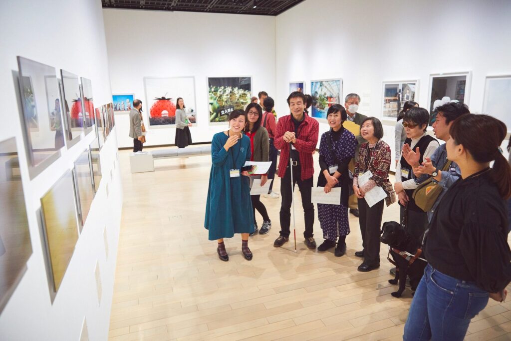 会場内の作品を前に、目の見える人・見えない人の2人のナビゲーターとともに、言葉を通してグループで作品を鑑賞します。